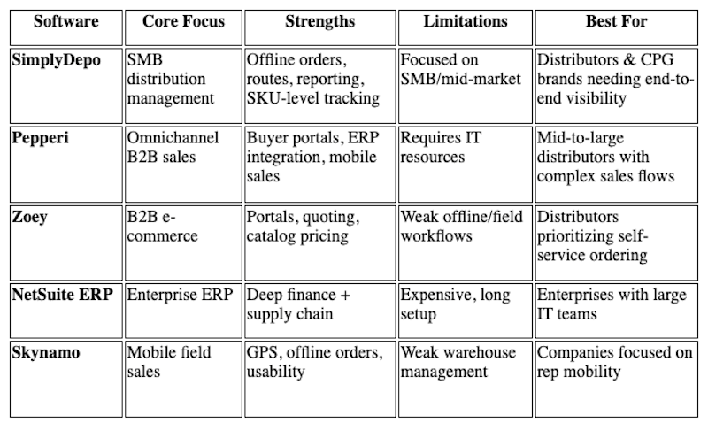 In 2025, the top choices include Zoey, Pepperi, NetSuite, Skynamo, and – especially for SMBs – SimplyDepo. With real customer success stories and measurable ROI, SimplyDepo shows why modern distributors are choosing it to power their growth.