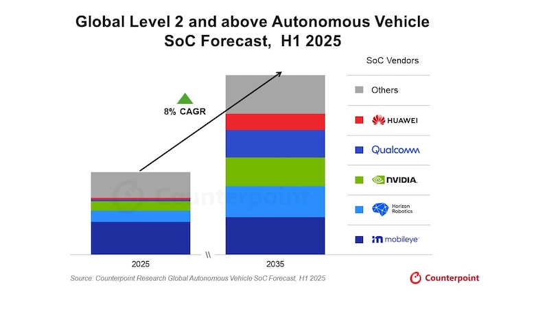 Mobileye, Nvidia, Qualcomm, Horizon Robotics and Huawei will emerge as the top five SoC suppliers for ADAS and autonomous vehicles with a combined share of over 78 percent by 2035, up from 69 percent in 2025, according to Counterpoint Research’s Global Autonomous Vehicle SoCs Forecast, H1 2025.