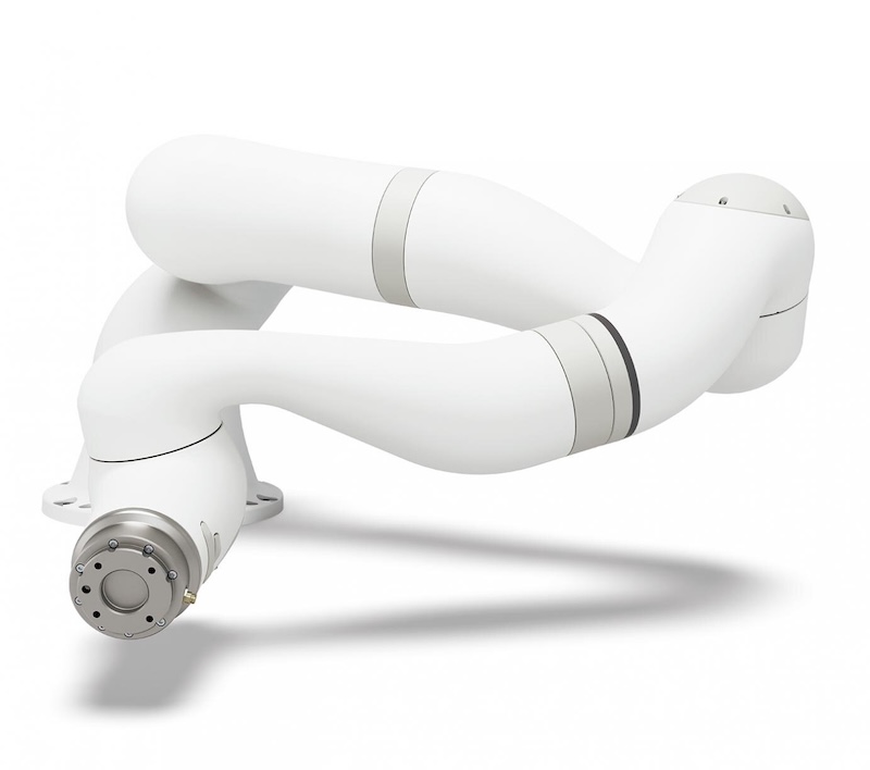 Weighing 45 kg, the robot arm can be floor-mounted and uses AC servo motors with a hollow-shaft design. Torque sensors are integrated on all seven axes, while position detection relies on absolute magnetic and optical encoders.