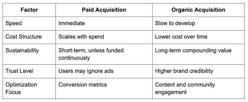 Organic acquisition focuses on attracting users naturally, without relying on direct advertising payments. This includes channels such as SEO, referral programs, social media activity, community building, word-of-mouth marketing, product-driven virality, and editorial content.