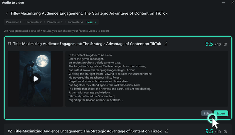 Once Filmora processes your audio, it generates multiple video results automatically rated by the system. Preview and pick your favorite version. You can even rename or reset it if you want to regenerate new results.