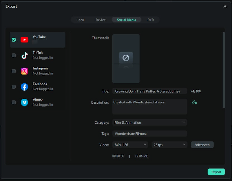Once your video looks perfect, click Export. Choose your preferred social platform, YouTube, Vimeo, or TikTok, and customize your settings like title, description, resolution, and category before uploading.