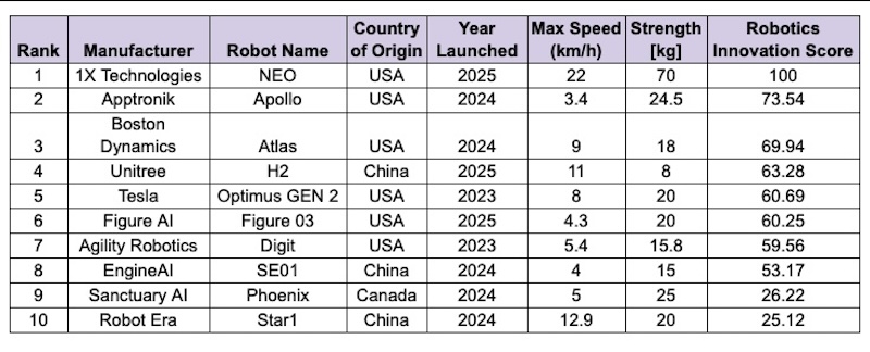 NEO (main image) achieves “a perfect innovation score of 100”, according to this study, establishing itself as “the most advanced consumer-focused humanoid robot currently available”.
