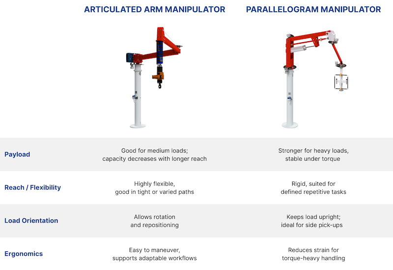 When the decision narrows to articulated versus parallelogram manipulators, the distinction comes down to how each design responds to the same set of factors.