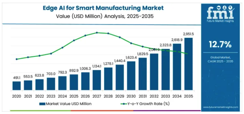 Market analysts value the edge-AI-for-smart-manufacturing segment at roughly $893 million in 2025 and forecast a 12.7% CAGR through 2035.