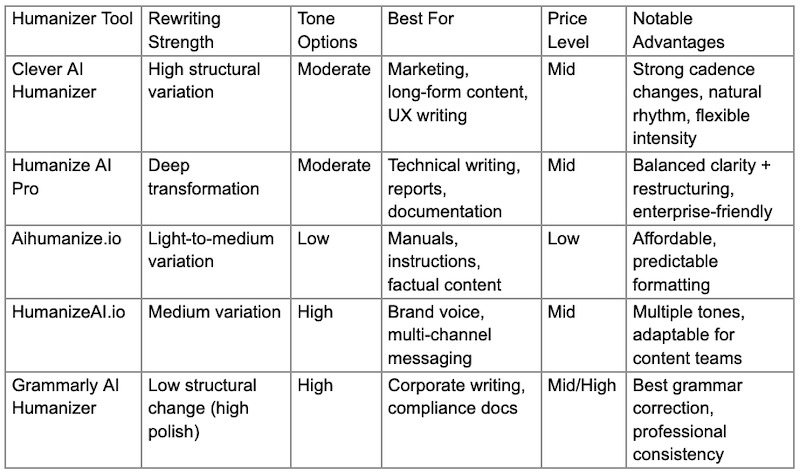 Comparative Table of Leading AI Humanizer Tools (2026)