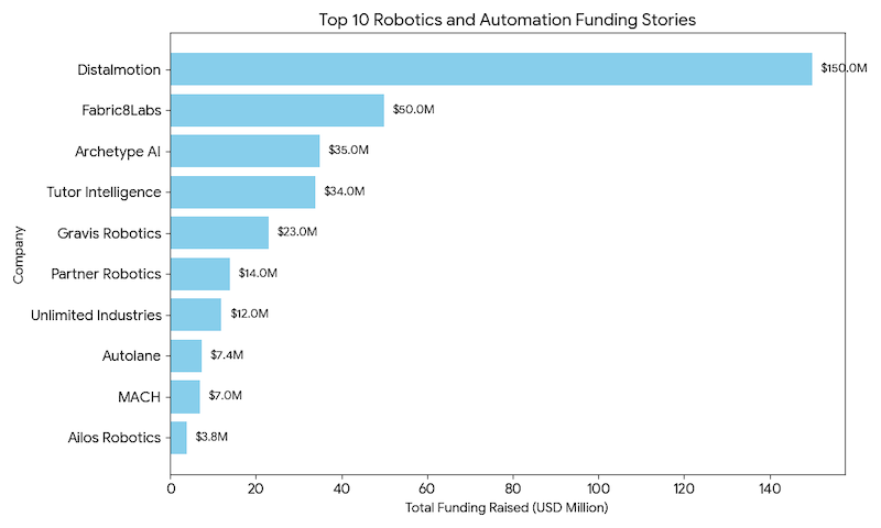 Medical and healthcare robotics remain strong, as demonstrated by Distalmotion’s $150 million raise to accelerate adoption of its Dexter surgical platform. Large, late-stage investments in clinical and regulated technologies continue to stand out.