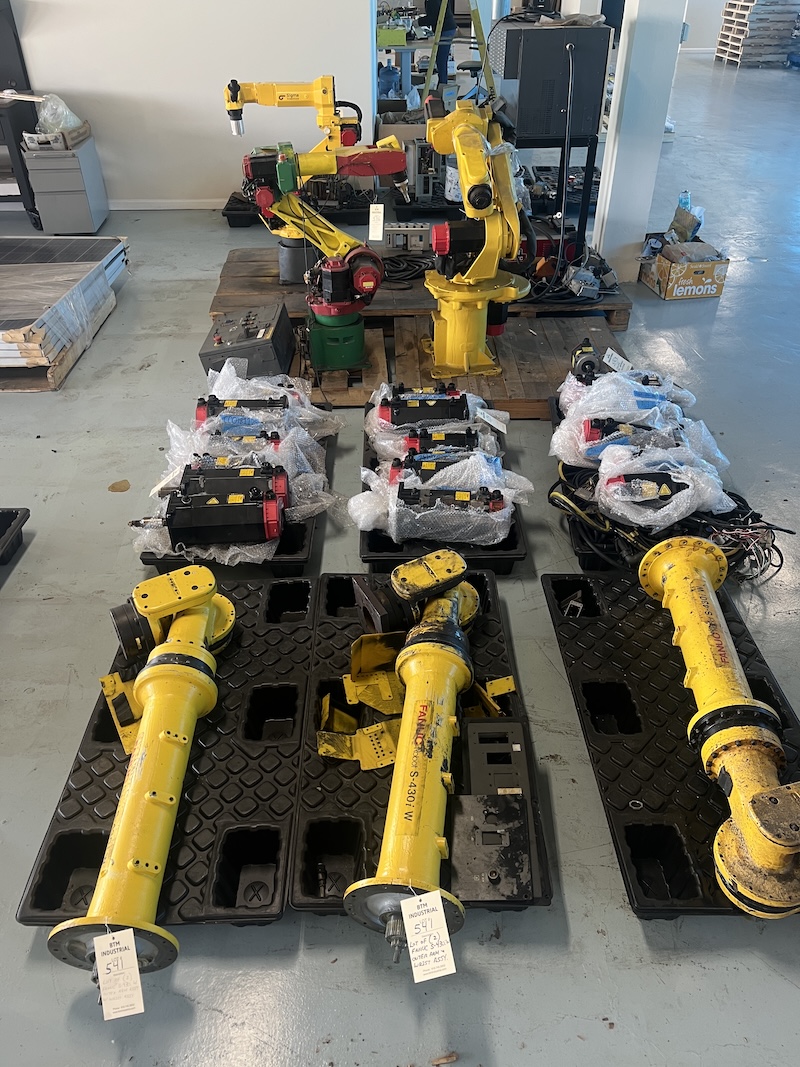 In addition to robots, the auction includes welders by Miller, Fronius, and Lincoln. A vast selection of Fanuc and ABB robot parts, motors, controllers, drives, and boards (many unused) are also for sale.
