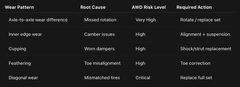 This is why tire wear patterns on AWD vehicles are not just a tire issue – they are a powertrain reliability issue.