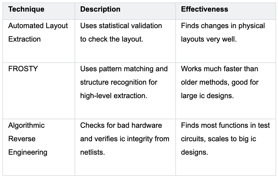 There are different ways to study an ic. These methods help you get the layout and find hidden data. The table below shows some good techniques: