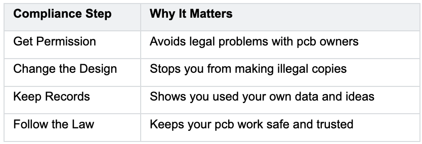 - Know the legal and ethical rules for PCB reverse engineering. Always ask for permission and respect original designs to avoid trouble.