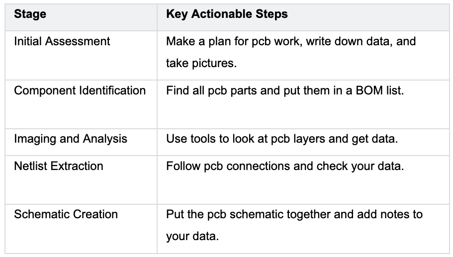 There is a simple path for pcb reverse engineering. Each step helps you gather data and build a schematic. Here are the main steps: