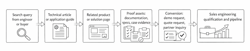 First, the query set is broader than product names. You must win problem and application queries, not only brand queries. Second, the content must be structured for decision making: comparison clarity, constraints, and validation assets matter more than persuasive copy.
