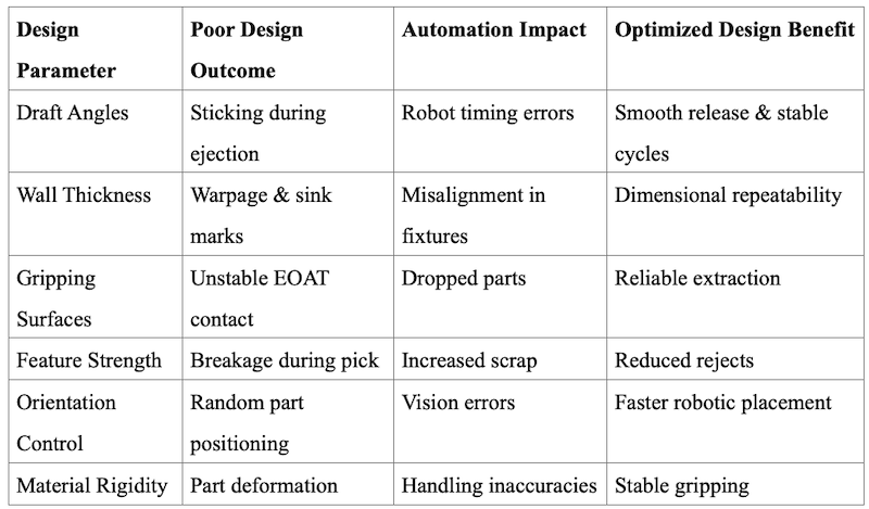 Geometry, material behavior, and handling features of parts have a direct impact on cycle time, and defect rates. Design for Automation (DfA) is a base engineering discipline that connects product design, mold design, and manufacturing productivity.