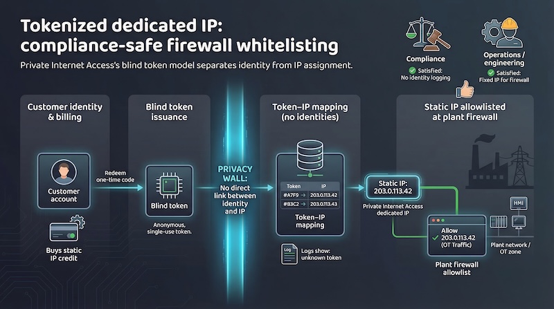 You buy the static IP, redeem a blind code, and the assignment breaks any tie to your account. If logs existed, they would show “unknown token,” not a username.