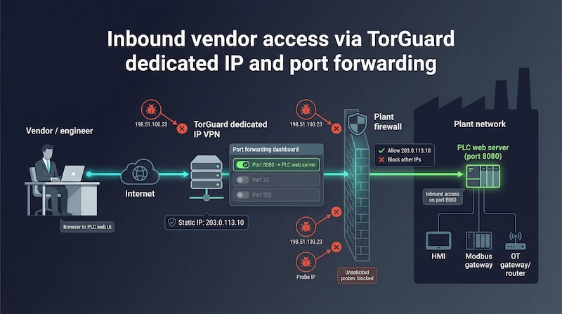 We tested the forward on a Modbus gateway and watched packets pass while every other unsolicited probe stayed out.