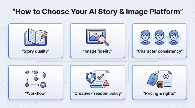 We tested 31 contenders, chose the top seven, and defined clear judging criteria – story quality, image fidelity, character consistency, workflow ease, content policy, and pricing – so you can pinpoint the right platform fast.